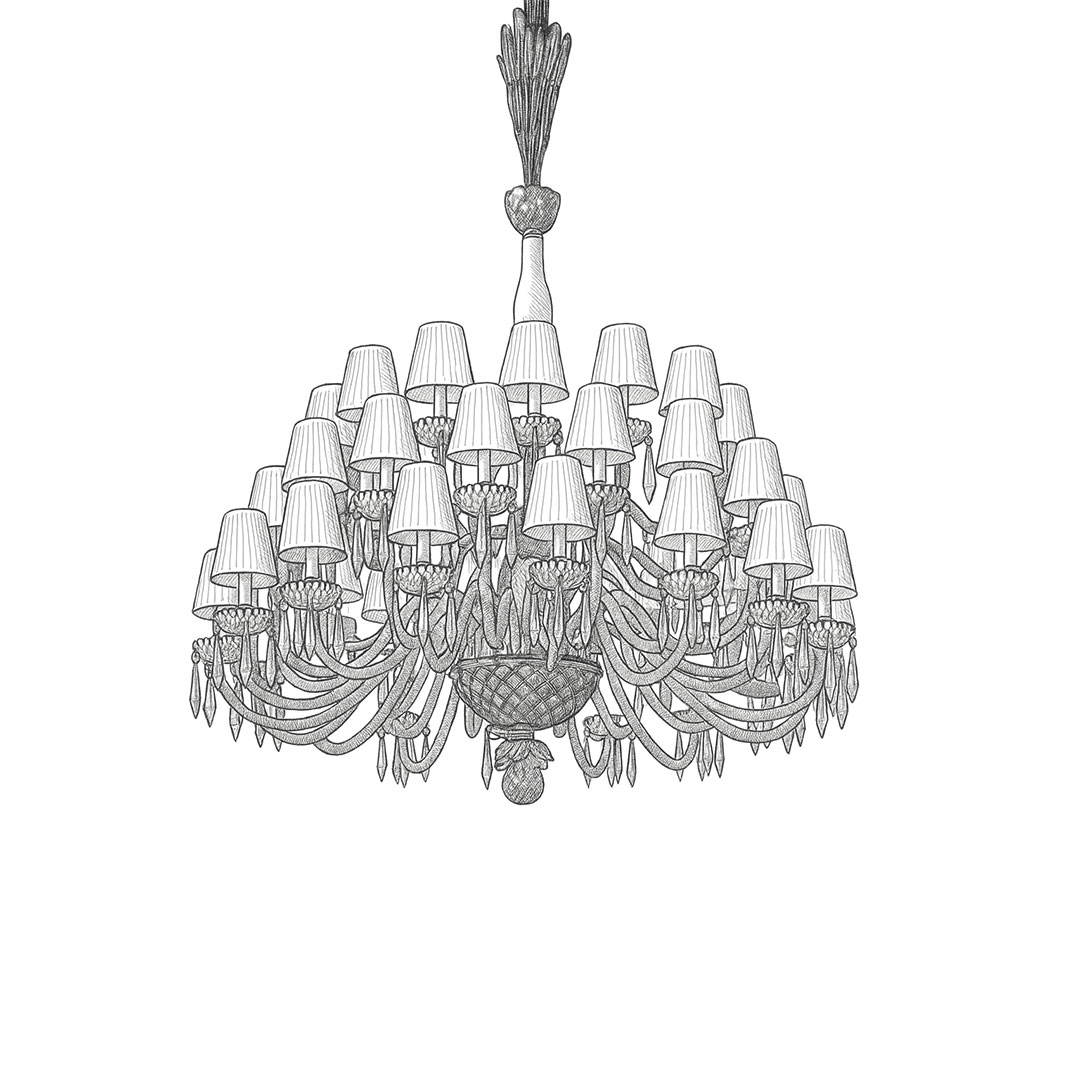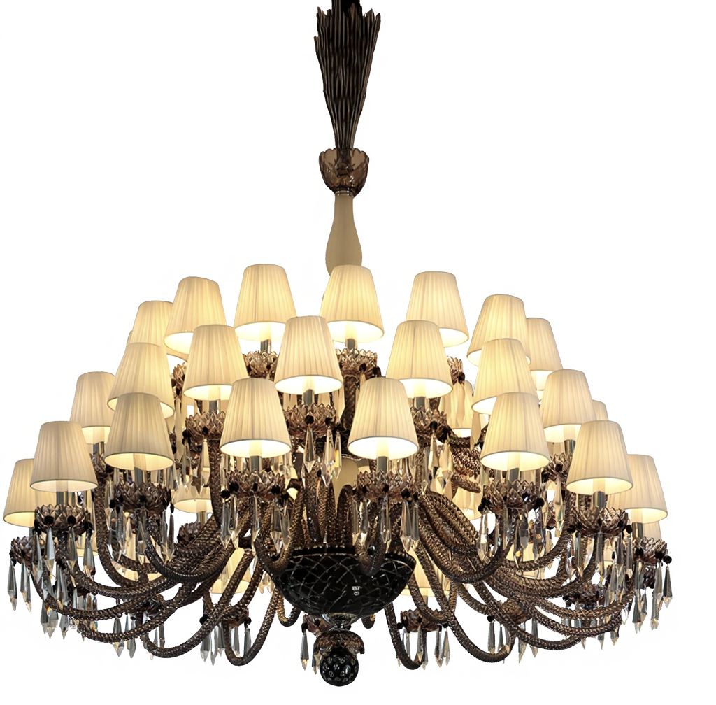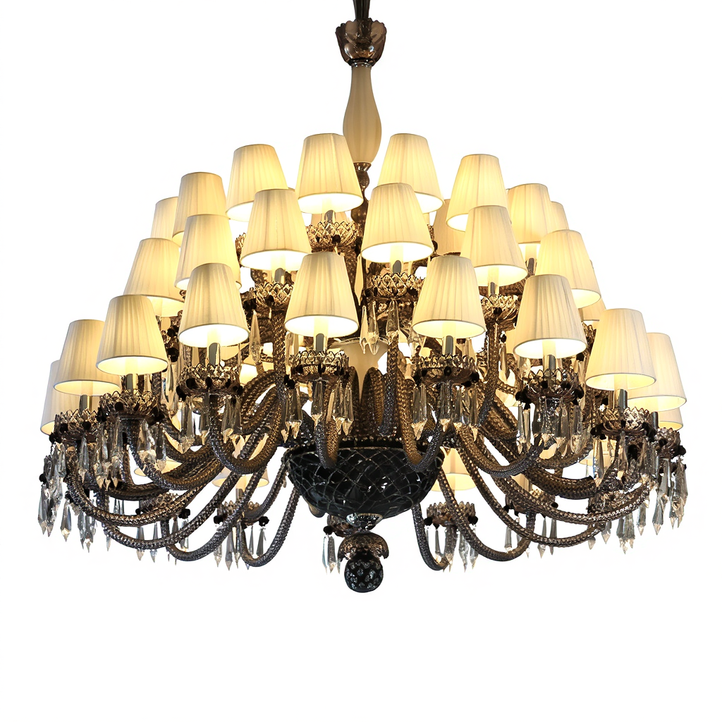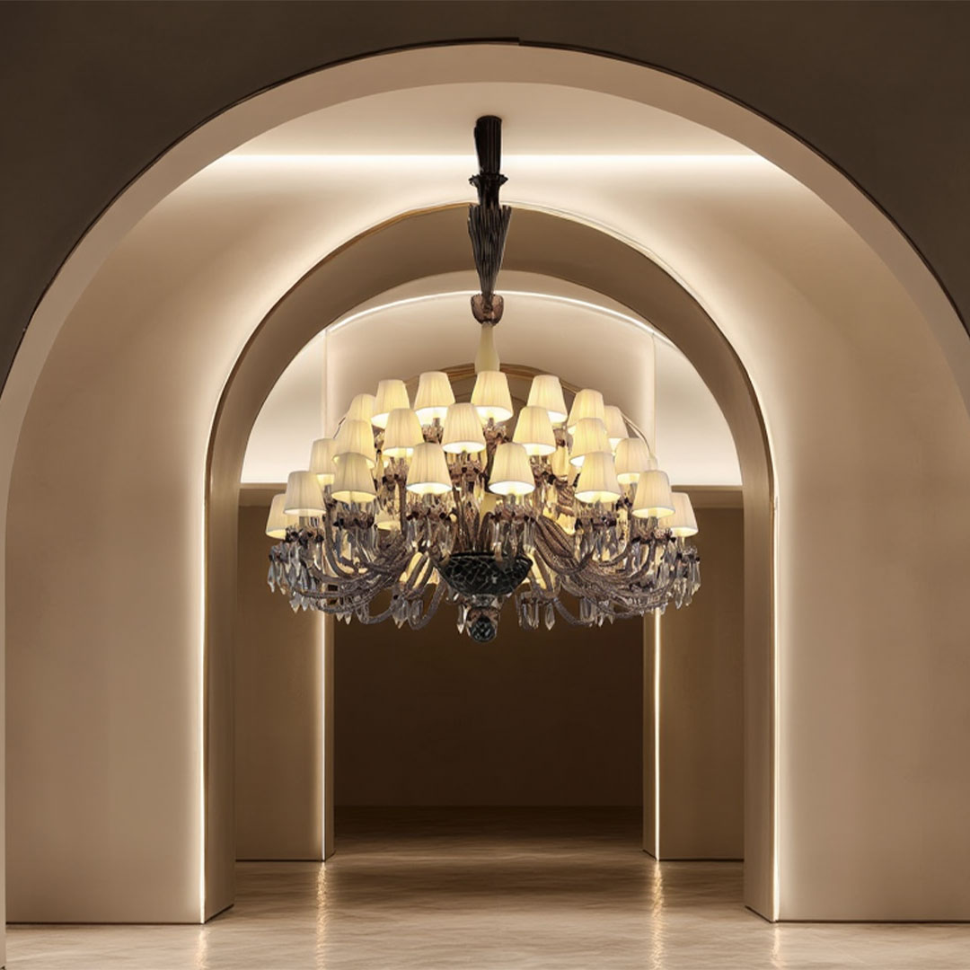 ثريا كريستالية فخمة متعددة الطبقات بتفاصيل دقيقة وحُبيبات براقة وقبّعات إضاءة أنيقة، تمنح المساحة طابعاً ملكياً راقياً.