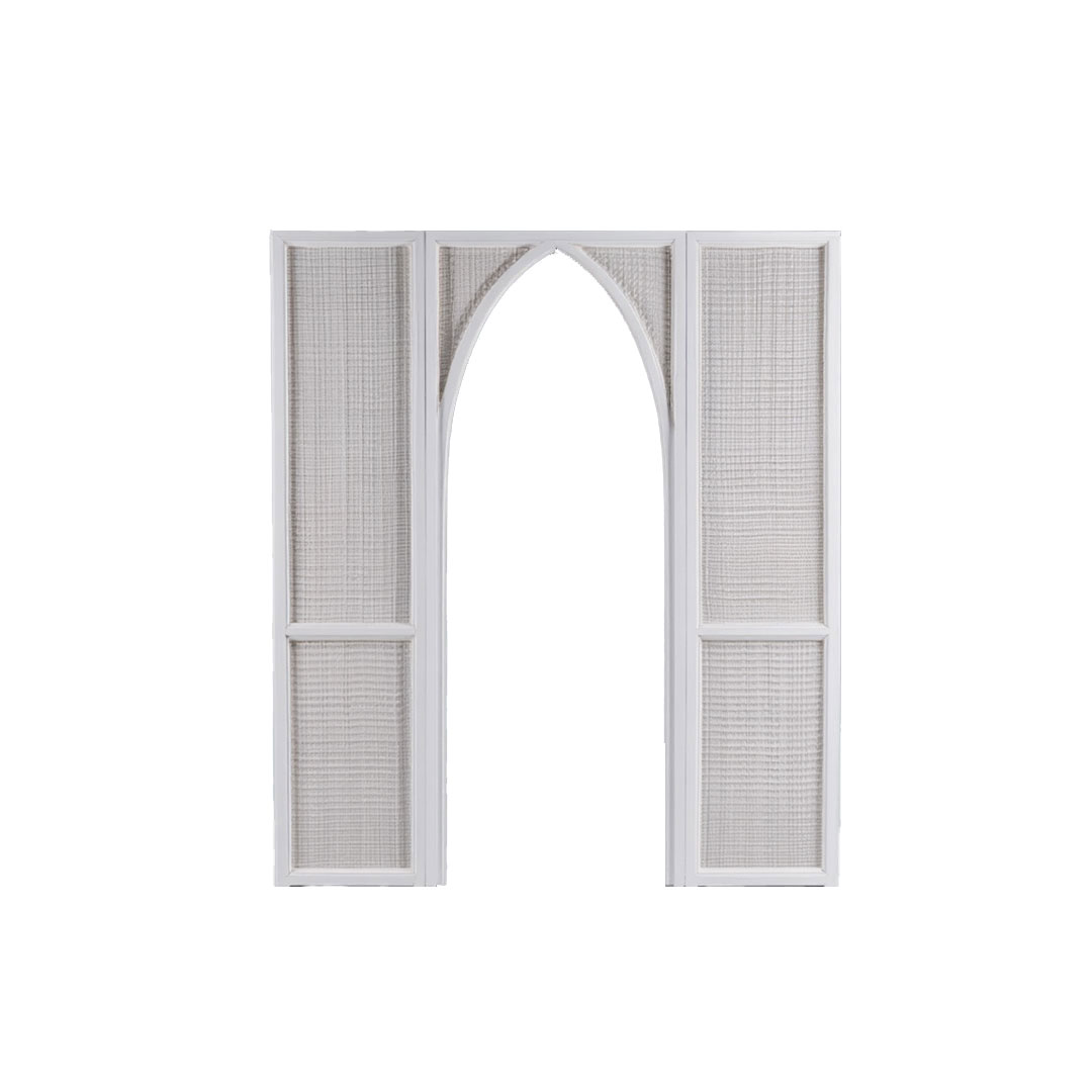 فاصل معماري أنيق بقوس ناعم وتفاصيل خشبية راقية بلمسات شبيهة بالقصب، يوفّر خصوصية خفيفة مع إضاءة مشرقة، مثالي للممرات والمساحات العصرية والخلفيات.